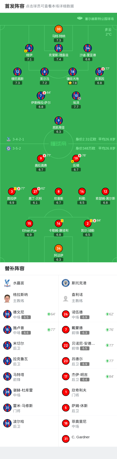 尽管斯托克港不断施加压力,但水晶宫并没有示弱。他们在场上展现出坚定的信念和团队合作,紧密配合,巧妙构建进攻。在后卫线上,水晶宫球员的紧密合作和有效的盯防让斯托克港难以突破,保护了球队的领先地位。在中场位置,水晶宫球员的传球和组织能力也发挥了重要作用,帮助球队牢牢控制比赛的节奏。