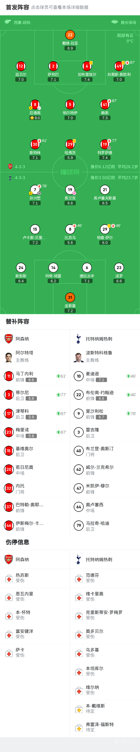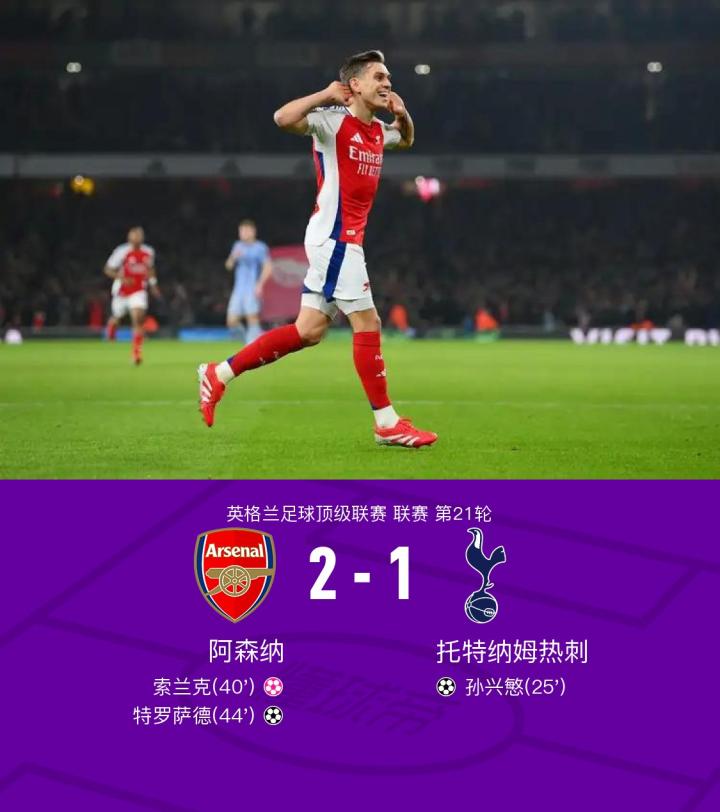 随后的比赛中,双方展开了激烈的对攻,特罗萨德多次尝试在禁区内造成威胁,但热刺门将德拉古辛表现出色,多次化解了对手的进攻。而阿森纳则在中场寻找机会,试图打破对手的防线。直到比赛进行到第25分钟,孙兴慜在禁区外远射,皮球变线飞入球门,热刺取得了1-0的领先。